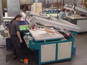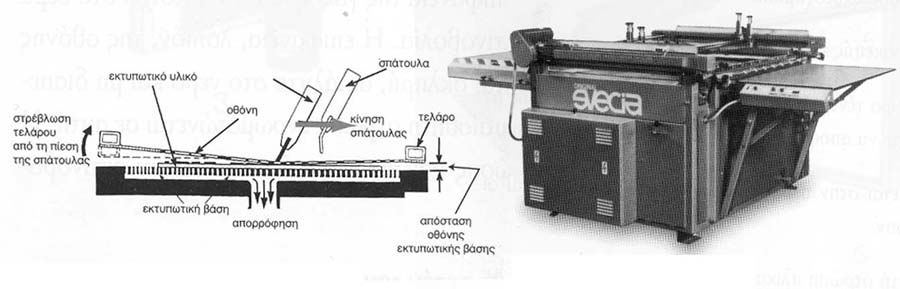 Σχηματική παράσταση εκτύπωσης επίπεδης μηχανής μεταξοτυπίας και επίπεδη μηχανή μεταξοτυπίας