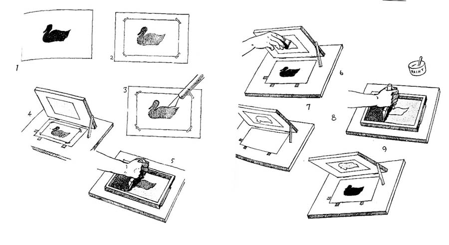 Όπως βλέπουμε και στο σχήμα, τοποθετούμε πάνω από το πρωτότυπο ένα ημιδιαφανές χαρτί και με τη βοήθεια κοπιδιού κόβουμε πάνω στο περίγραμμα του θέματος. Όλο μαζί το ημιδιαφανές χαρτί, χωρίς να απομακρύνουμε το κομμάτι που κόψαμε, το τοποθετούμε κάτω από την επιφάνεια της οθόνης και στη συνέχεια με τη βοήθεια σπάτουλας την επιχρίουμε με μελάνι συμπιέζοντας την επιφάνειά της πάνω στο ημιδιαφανές χαρτί. Το μελάνι διαπερνά τη γάζα και, επειδή έχει κολλώδη υφή, κολλά το ημιδιαφανές χαρτί μαζί με το κομμάτι που κόπηκε πάνω στην οθόνη. Απομακρύνοντας το κομμένο κομμάτι, αποκτούμε μία εκτυπωτική επιφάνεια προστατευμένη από το χαρτί που παρέμεινε κολλημένο.