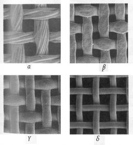 Δομή πλέγματος νημάτων γάζας α) από μετάξι, β) & γ) δύο διαφορετικά είδη πολυεστέρα και δ) από ατσάλι