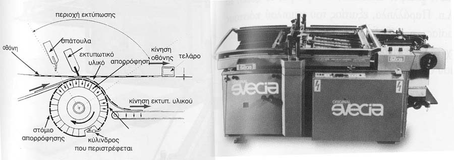 Σχηματική παράσταση εκτύπωσης κυλινδρικής μηχανής μεταξοτυπίας και κυλινδρική μηχανή μεταξοτυπίας