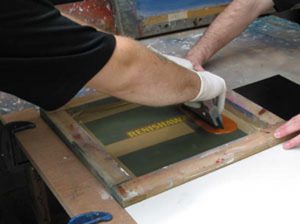 Στη συνέχεια, επιχρίουμε τη γάζα με μελάνη και με τη βοήθεια σπάτουλας που ασκεί πίεση, υποχρεώνουμε τη μελάνη να περάσει μέσα από τις οπές της γάζας. Η μελάνη στη συνέχεια φτάνει στο υπόστρωμα μόνο μέσα από τις επιφάνειες της γάζας που αντιστοιχούν στα ανοίγματα της χάρτινης μάσκας. Με τον τρόπο αυτό παίρνουμε ικανοποιητικά αποτελέσματα εκτύπωσης, όσον αφορά στα περιγράμματά της, για όσα τυπώματα αντέχει το χαρτί.